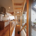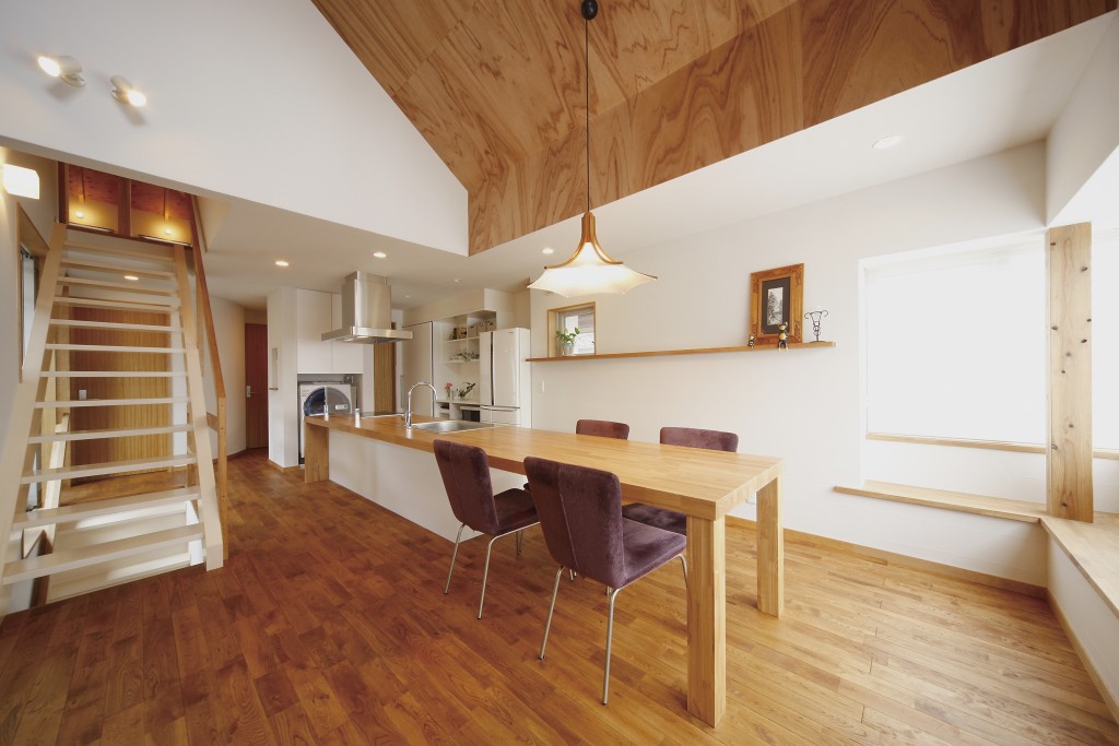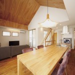キッチンカウンターからそのままつながるダイニングテーブル。会話をしながら料理ができるのでコミュニケーションが取りやすくなります。 料理をしたらそのまますぐに配膳できるので家事動線が短くなり、食べる人と作る人の一体感が生まれます。 半円形で優しい雰囲気の床の間と縁のない目積畳が都会的な和室。 広々としたロフト。壁面の窓だけでなく、天窓があるので、暗くならず、開放的。