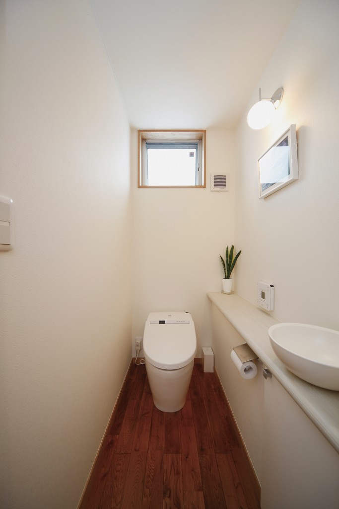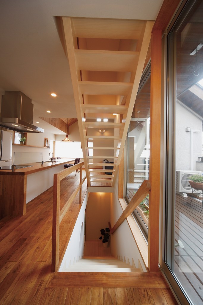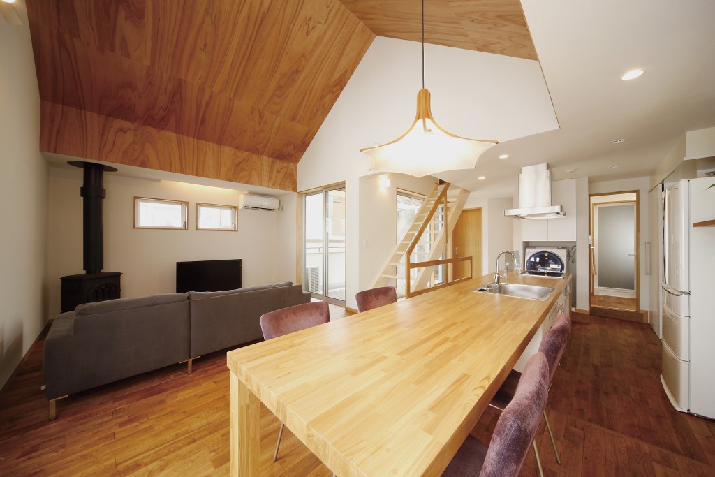 建築地の周辺は桜並木や公園が点在する緑豊かな環境です。この環境に調和するように外壁には無垢の木や自然素材の壁を使用しています。ご家族が集まるリビングは日当たりの良い2階に設け、薪ストーブで暖を取り、料理もできる開放的で豊かな空間としています。リビング天井はコストを抑えながらも木目を生かした仕上げにしました。