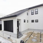 外観は、軒・ケラバを大きく出し、玄関先と外構には、格子を多様して和の雰囲気を演出しています。 -