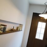 日差しをほどよく取り込む採光タイプの玄関ドアをあけると、愛らしい雑貨の並ぶニッチがお出迎え。 -