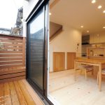 リビングとつながるウッドデッキはベンチを設え、寛ぎのスペースに。 -